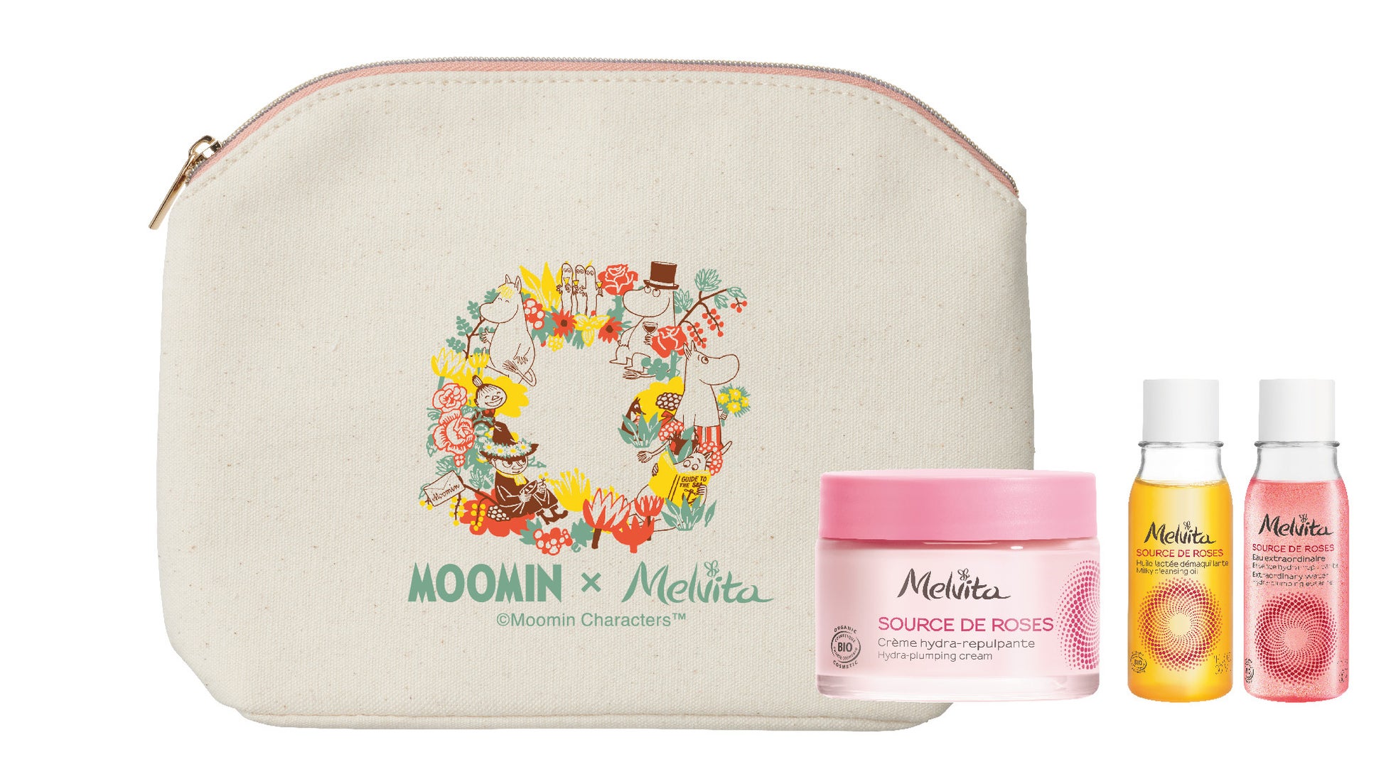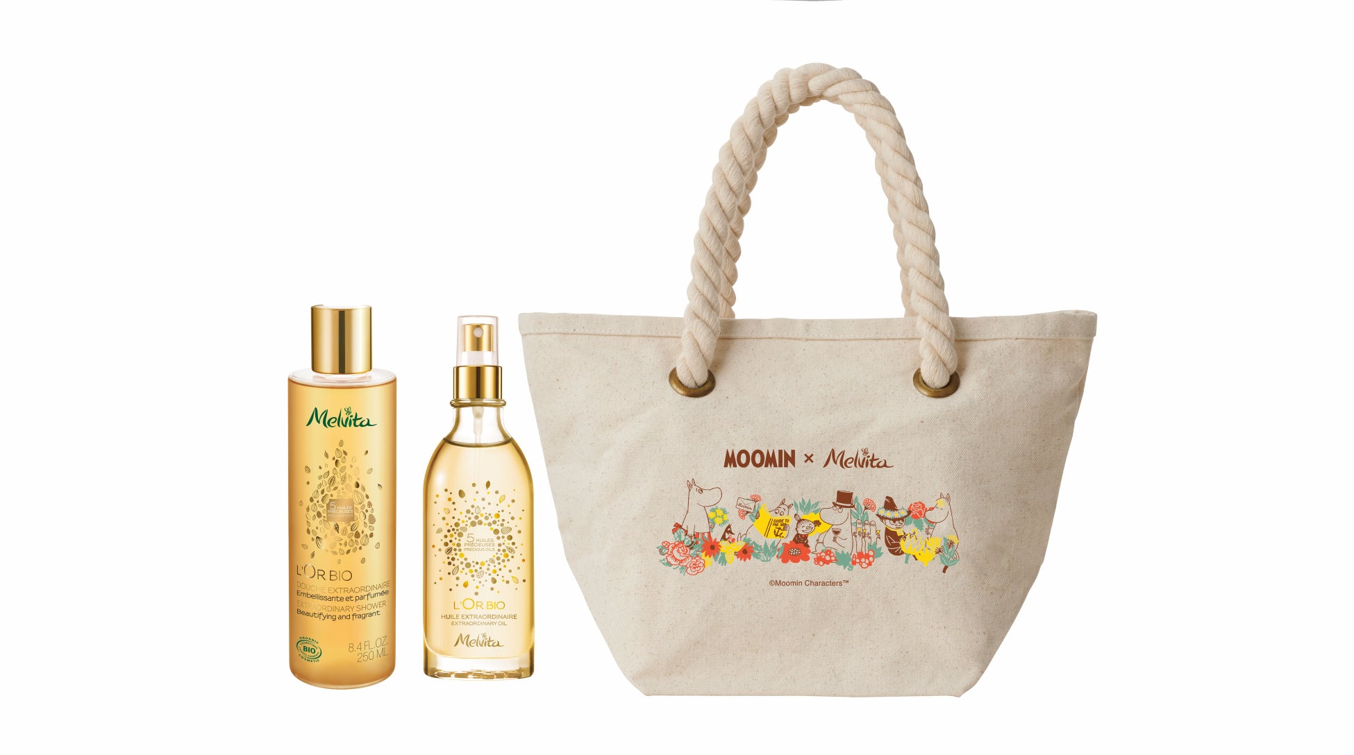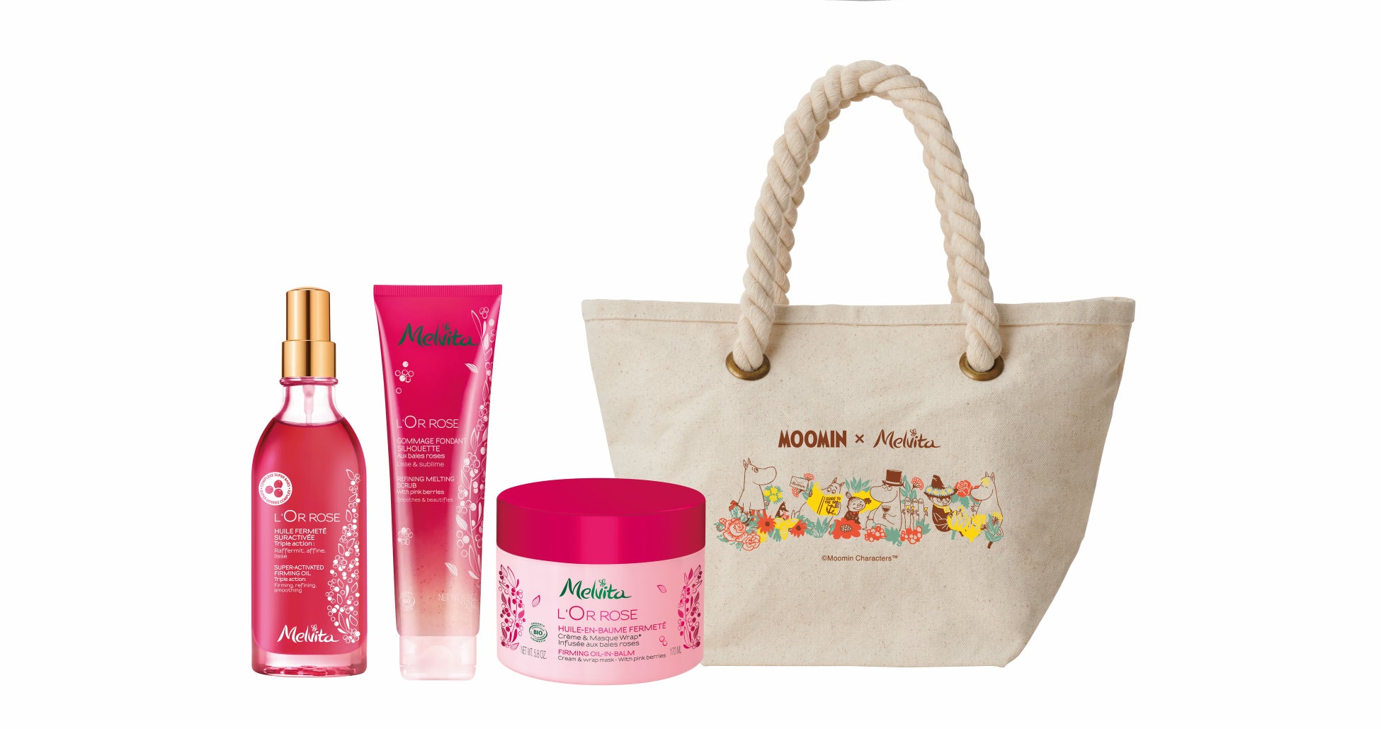 ムーミン谷の仲間が揃ったトートバッグに、肌を引き締め、みずみずしくヘルシーなハリ感を与えるロルロゼのボディケア3品が入った贅沢なセット。
