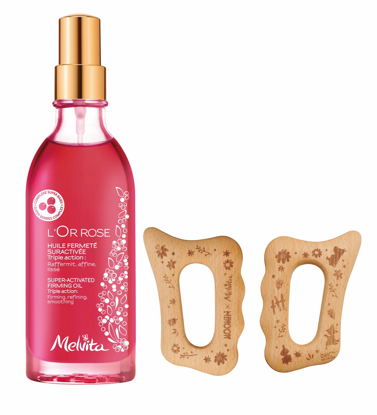 かわいいムーミン柄のカッサ付き。肌を引き締めるピンクのオイル。