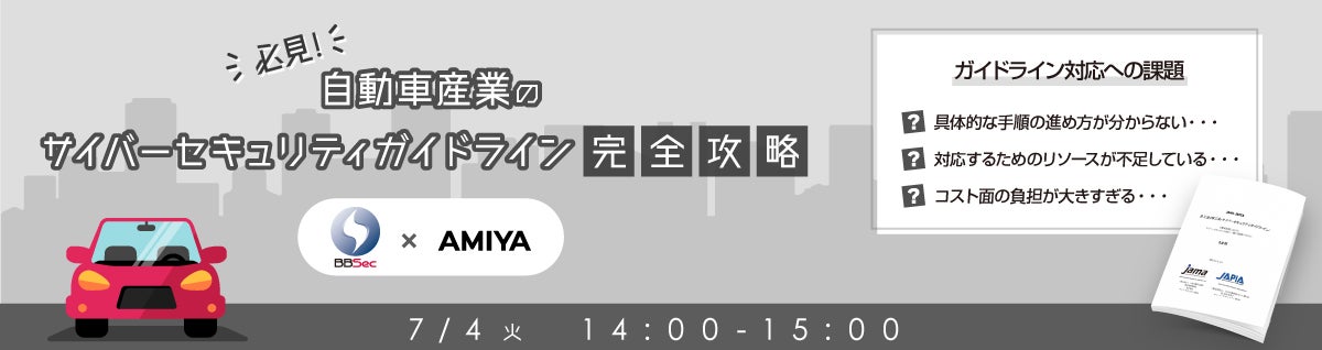 なお、今回の協業により提供を開始する「自動車部品業界向け情報セキュリティ対策支援サービス」について、より詳細をご案内する無料オンラインセミナー『必見!自動車産業のサイバーセキュリティガイドライン完全攻略』の開催も決定しました。