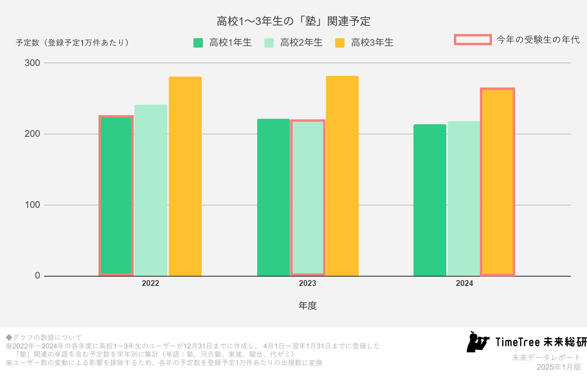 しかし、今の高校3年生が1年生だった2022年度からの「塾」に関連する予定登録状況を集計してみると、登録予定1万件あたりの「塾」関連予定の出現数は2022年度から2024年度まで変わらず、高校1年時点から高校3年の8割近い「塾」関連予定が登録されていることがわかりました。