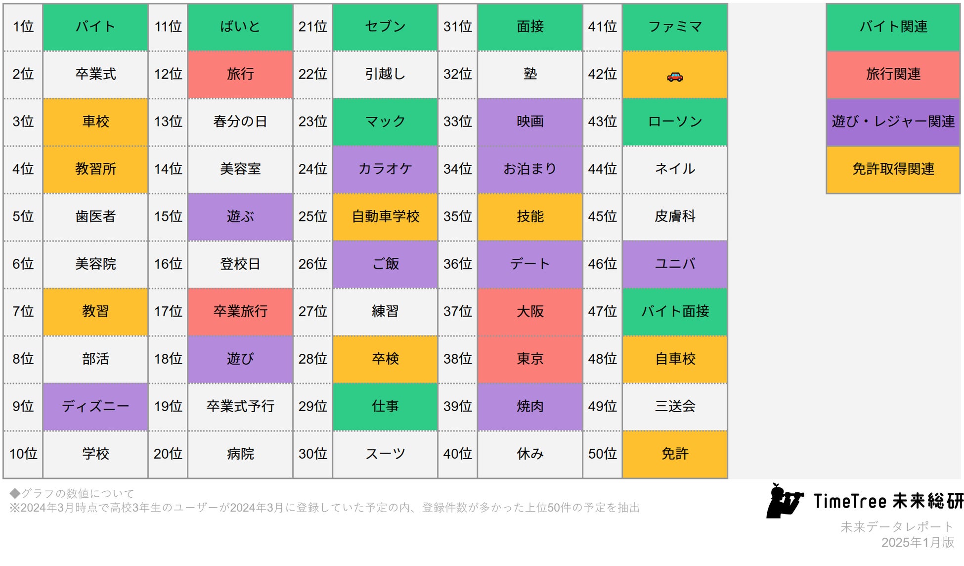 2024年3月に登録されていた登録数上位50件の予定を抽出すると、「バイト」や「旅行」「遊び・レジャー」「免許取得」などの予定が多く登録されていました。それまで勉強に専念していた分、最後の高校生活は思う存分やりたいことを楽しんでいるような高校生活が垣間見えました。