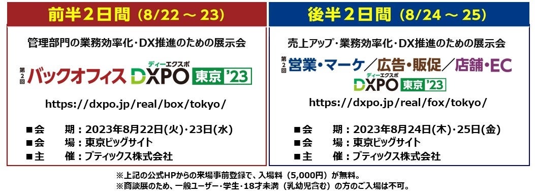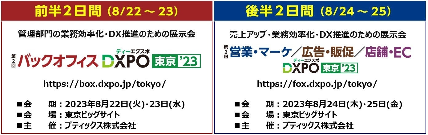 業界に特化した商談型展示会事業などを展開する、ブティックス株式会社(東京都港区、代表取締役社長 新村祐三、東証グロース上場 証券コード:9272)は、企業の業務効率化・売上アップ・DX推進をテーマとした以下の2つの展示会を、東京ビッグサイトにて連続開催する。