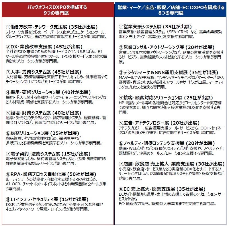 後半2日間[2023年8月24日(木)・25日(金)]開催の、『第2回 営業・マーケ/広告・販促/店舗・EC DXPO東京’23』は、製品ジャンル毎に、8つの展示会で構成され、MAツール、CRM、SFA、アドテクから、営業代行、コンテンツ制作、店舗のDX化、ECサイト構築まで、営業・マーケ・販促部門および、店舗・ECの売上アップ・業務効率化を支援する注目のIT製品が一堂に出揃う。