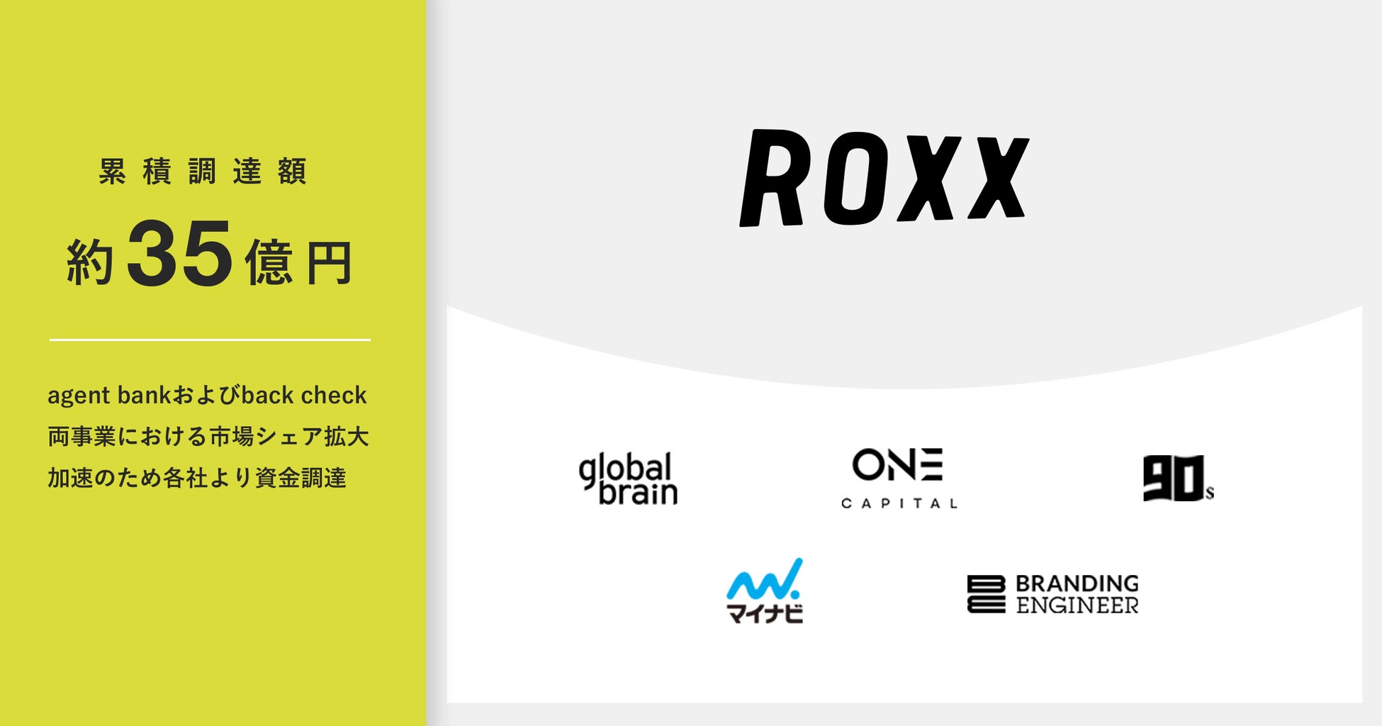 株式会社ROXX(本社:東京都新宿区、代表取締役:中嶋汰朗)は、2022年11月2日、One Capital、グローバル・ブレイン、マイナビ、90s、Branding Engineerを引受先とする、総額10億円の第三者割当増資をシリーズBラウンドにて実施したことをお知らせいたします。これにより累積資金調達総額は約35億円となり、人材紹介ビジネスに特化したクラウド求人データベース『agent bank』および、オンライン完結型リファレンスチェックサービス『back check』への事業投資を積極的に行うとともに、採用活動の強化に取り組んでまいります。