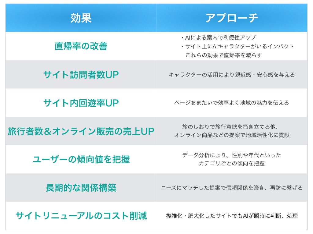 観光情報サイトに簡単に導入でき、サイトの「直帰率」「閲覧数」を改善、ひいては地域来訪者数アップが期待できます。