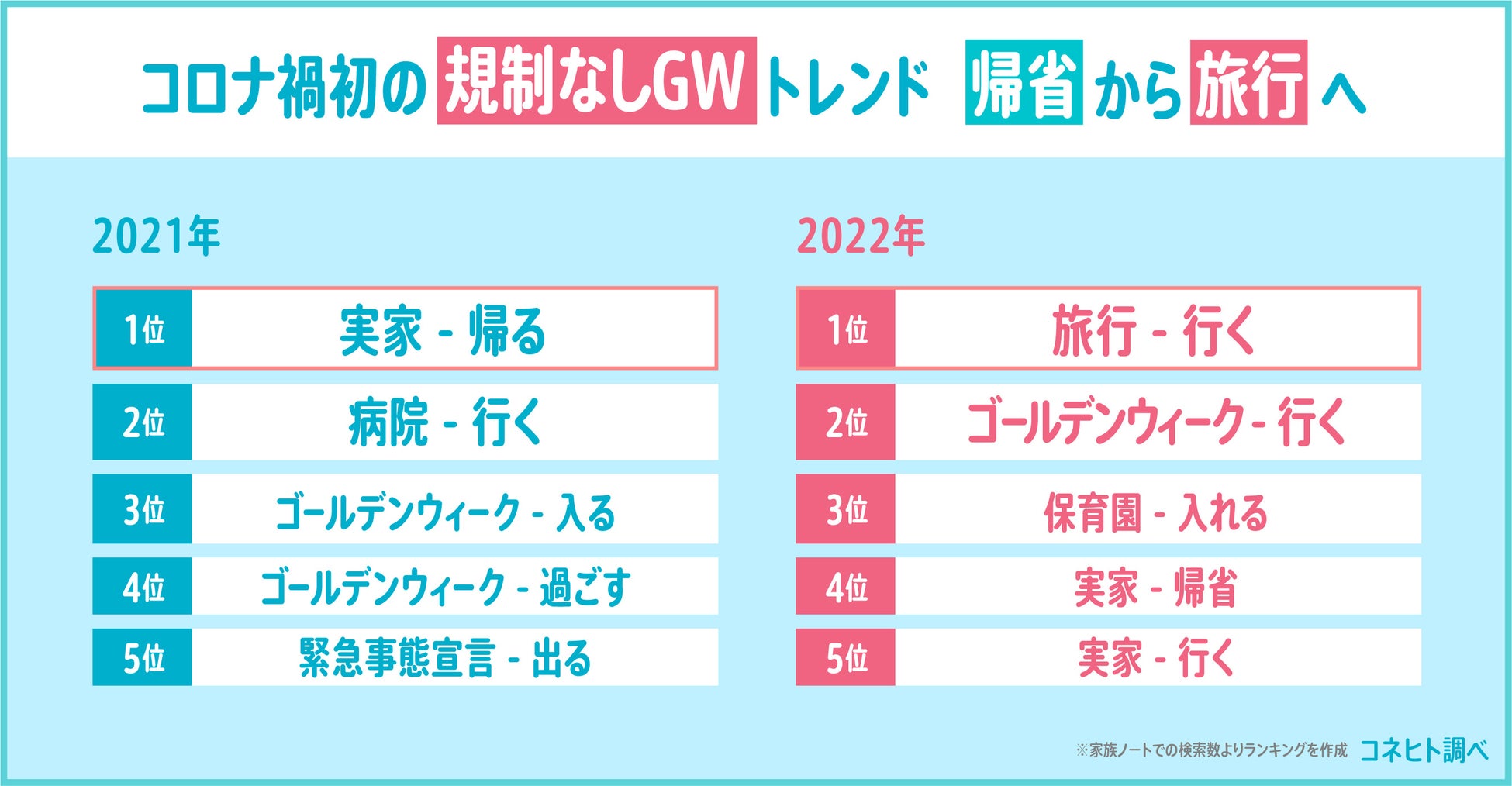 ママリ内の「ゴールデンウィーク」に関連する検索ワードを2021年と2022年とで比較すると、ランキング1位が2021年は「実家・帰る」、2022年は「旅行・行く」になっており、家族の関心が「帰省」から「旅行」に変化していることがわかります。