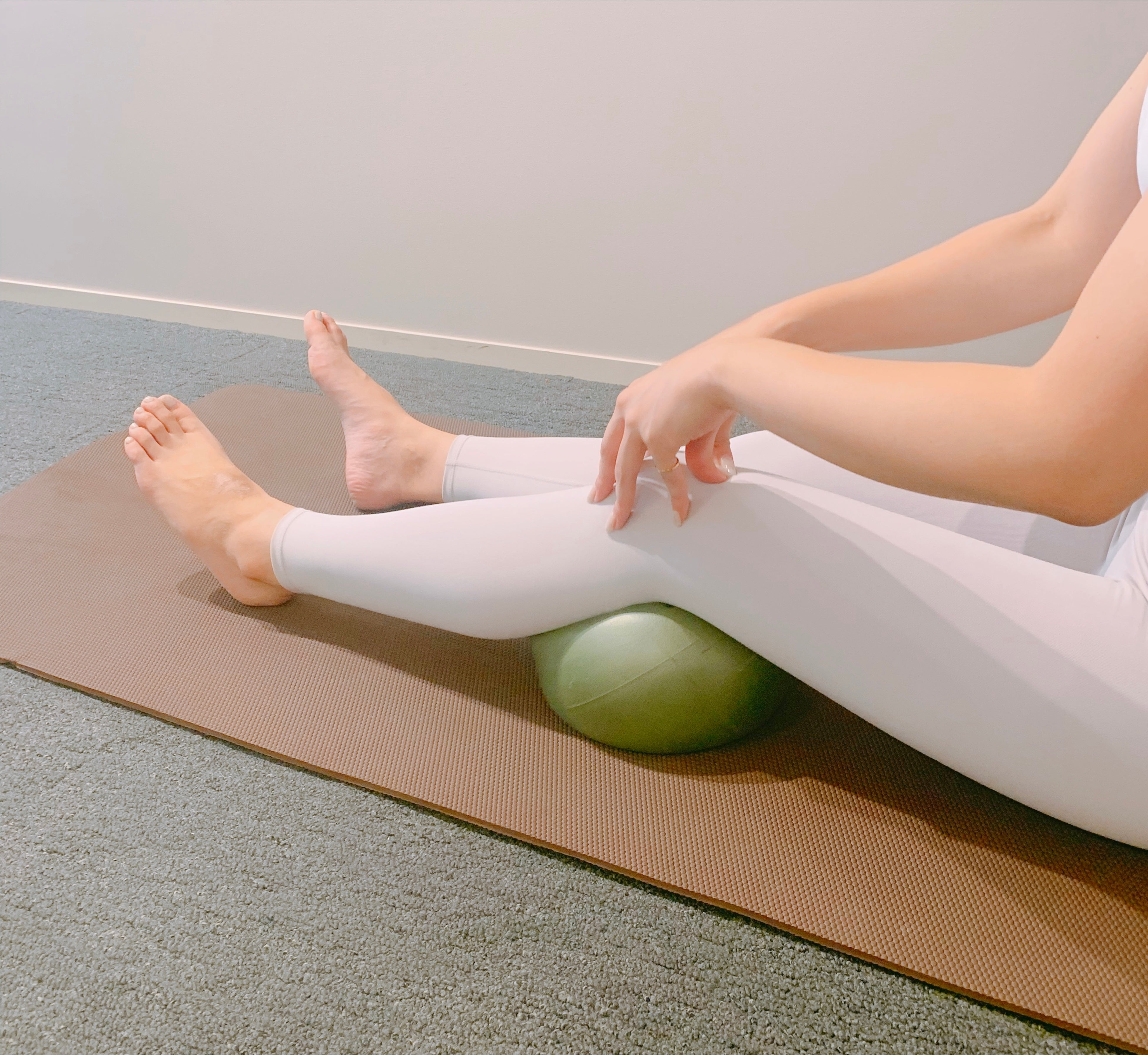 左膝の下に、フィットネスボールを入れます。脚の力はなるべく抜いておきましょう。