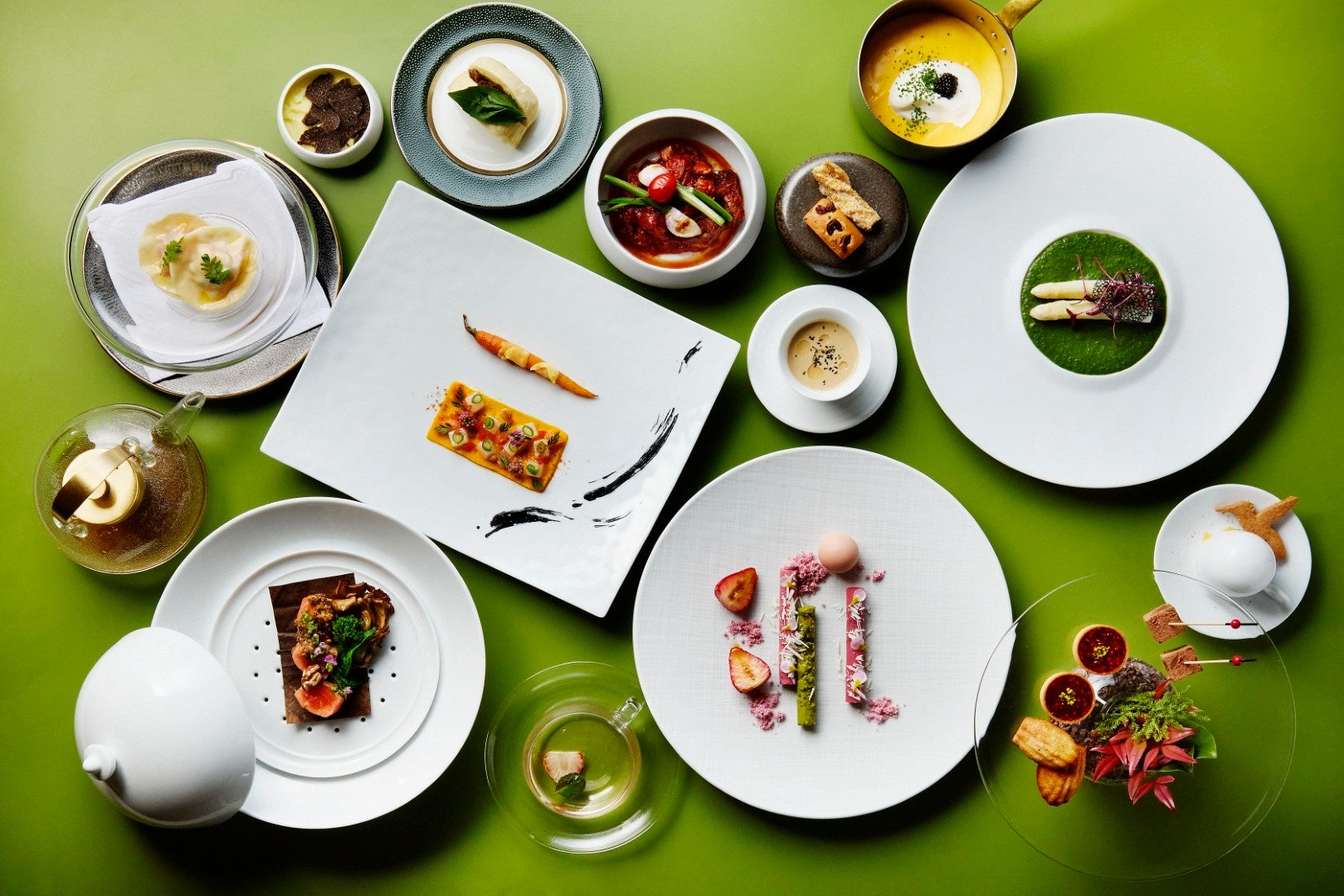 アミューズには、シャンパーニュにもよく合う自家製オリーブフィナンシェ、チーズパイ、フォアグラとポルチーニのフランをご用意しました。続くアペタイザーには、シェフが幼い頃に母が作ってくれた手料理から着想を得た、にんじんとイカを組み合わせた一皿を。色あざやかな姫人参とみかんのピューレにアオリイカのタルタルを散りばめ、春の息吹を感じる彩り豊かな前菜を作り上げました。春を象徴する白アスパラガスには、お客様の目の前でオランデーズソースの最後の仕上げをし、ふわっとかけて、プレートを完成させます。肉厚で味のしっかりとしたブルーオマール海老を使ったラビオリには、レモン風味のコンソメを注いで、スープとともに召し上がっていただきます。魚料理は鱒をミディアムに焼いて朴葉で香りよくスモークし、胡桃ドレッシングと菜の花を合わせた、春の趣あふれる一皿です。メインディッシュには、北海道産の仔羊を骨付きのまま、かぶと旨味豊かなトマトとともにじっくり煮込んだ一皿をお届けします。芳醇なトマトソースは、フォカッチャや黒トリュフを贅沢に添えたポテトピューレと合わせてお楽しみいただけます。デザートには、鎌倉産ホワイトチョコレートを繊細にあしらった、いちごのムース。桜のアイスクリームとともにお召し上がりください。冷たい余韻のあとの自家製いちごティーが、春らしい香りと温かさを届け、食後のひとときを優雅に結びます。