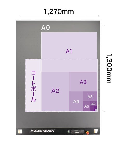 現行の大判フラットベッドUVプリンタJFX200-2513 EXから約30%小型化したミドルサイズモデル。プリント基材の取り替え時に装置の反対側に回り込まなくても手が届くため、オペレーションが簡単です。コンパクトモデルでありながら、国際規格のA0サイズに対応し(図1)ポスターサイズの汎用サイングラフィックパネルの制作が可能です。