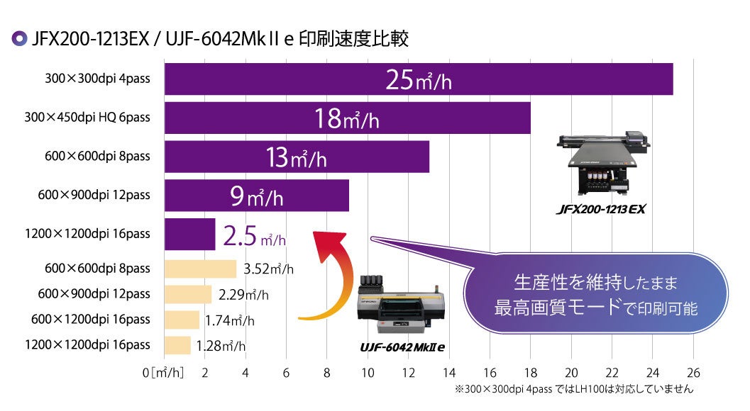 当社のJFX200-2513 EXはエントリーレベルの大型フラットベッドプリンタ市場ではトップクラスの生産性を誇ります。コンパクトサイズにしたJFX200-1213 EXは最大プリント速度25㎡/hを実現。最高画質モードでも2.5㎡/hと当社のデスクトップUVプリンタUJFシリーズの標準モードと同等のため(図2)、その生産性を維持したまま最高画質モードで使用可能、また、同等の画質モード比では生産性が最大約4倍向上します。プリンタの増設とオペレーターの増員をせずに生産ボリュームを増やせる、デスクトップUVプリンタのアップグレードに最適な1台です。