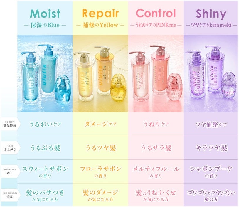 「うるおいのモイスト」、「ダメージケアのリペア」、「うねりケアのPINKme」、「ツヤ補整ケアのキラメキ」の4シリーズ展開。