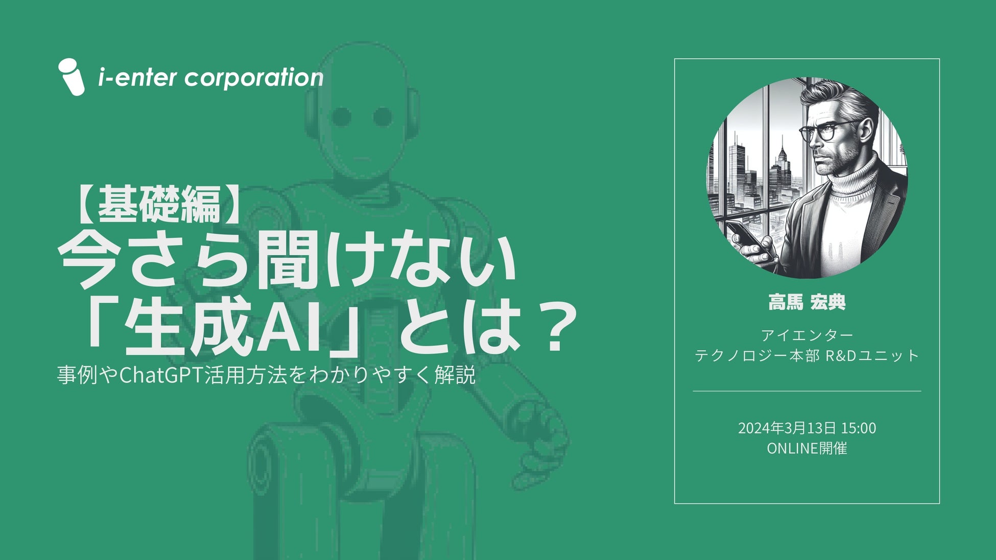 株式会社アイエンター(本社:東京都渋谷区、代表取締役:入江 恭広)は、2024年3月13日(水)にオンライン配信にて『【基礎編】今さら聞けない「生成AI」とは?事例やChatGPT活用方法をわかりやすく解説』ウェビナーを開催します。