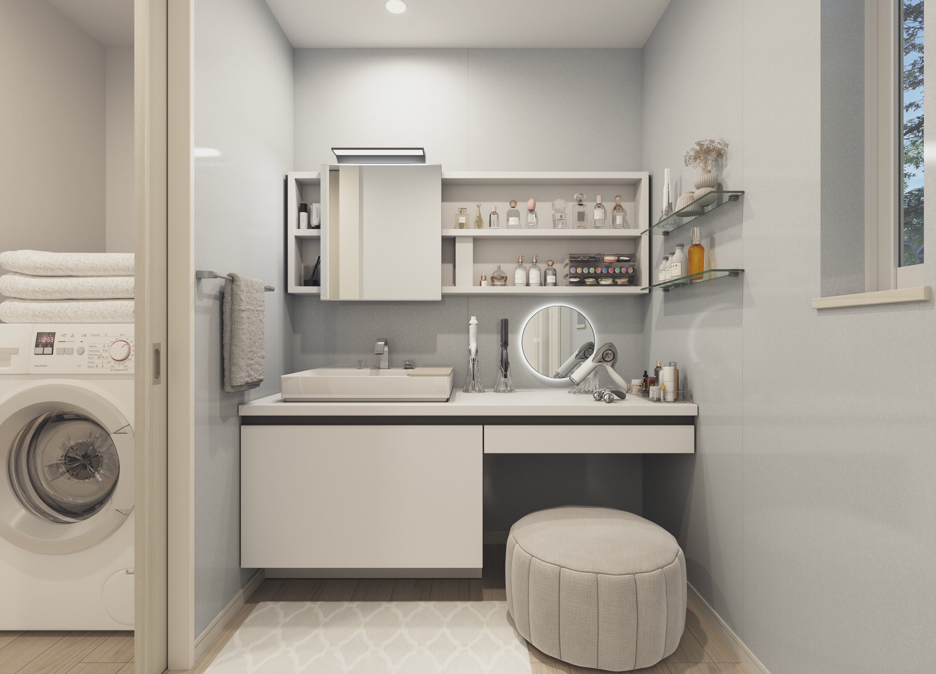 ReFa VITAL ROOMでは、両サイドにガラス棚を取り付け、お気に入りのアロマやお化粧品をオシャレに収納。正面の収納棚やドロアーも併せると、ご家族皆様のスキンケアやヘアケア製品を十分に収納できます。大きく左右に移動するスライドミラーと、スツールに腰かけた際 にちょうどいい高さにもう一つ大きなミラーをご用意しました。コンセントは、ご家族それぞれがストレスなくこだわりの家電を使いやすいように3口 ご用意しました。ReFa VITAL ROOMでしか味わえないジブン時間をお楽しみください。