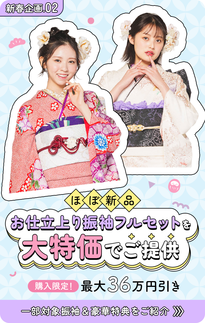 最大36万円引き!撮影で1度しか着ていないほぼ新品のお仕立上り振袖を、新春限定の特別価格でご提供。