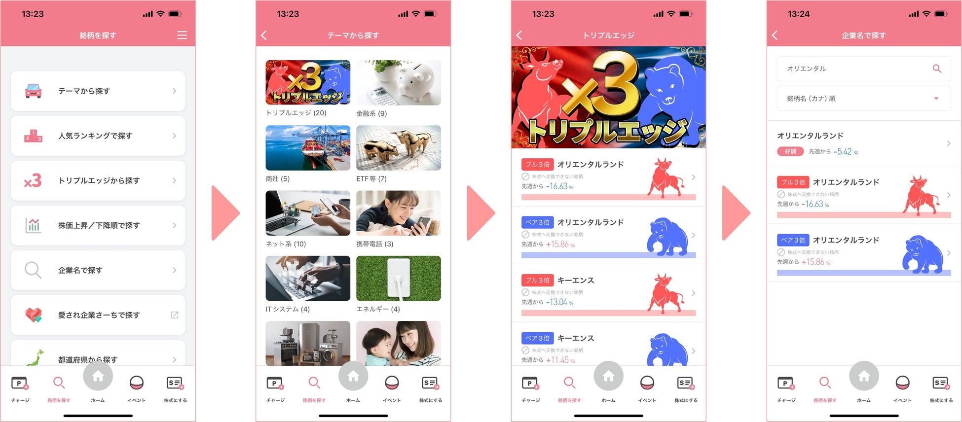・該当する銘柄における日々の騰落率の3倍もしくは-3倍(逆方向に3倍)に 連動してポイントが増減します ・対象アプリはSTOCK POINTで運営する他アプリでも順次拡大を予定して います ・対象銘柄はユーザーの皆様の運用状況やご意見を伺いながら追加検討を してまいります |