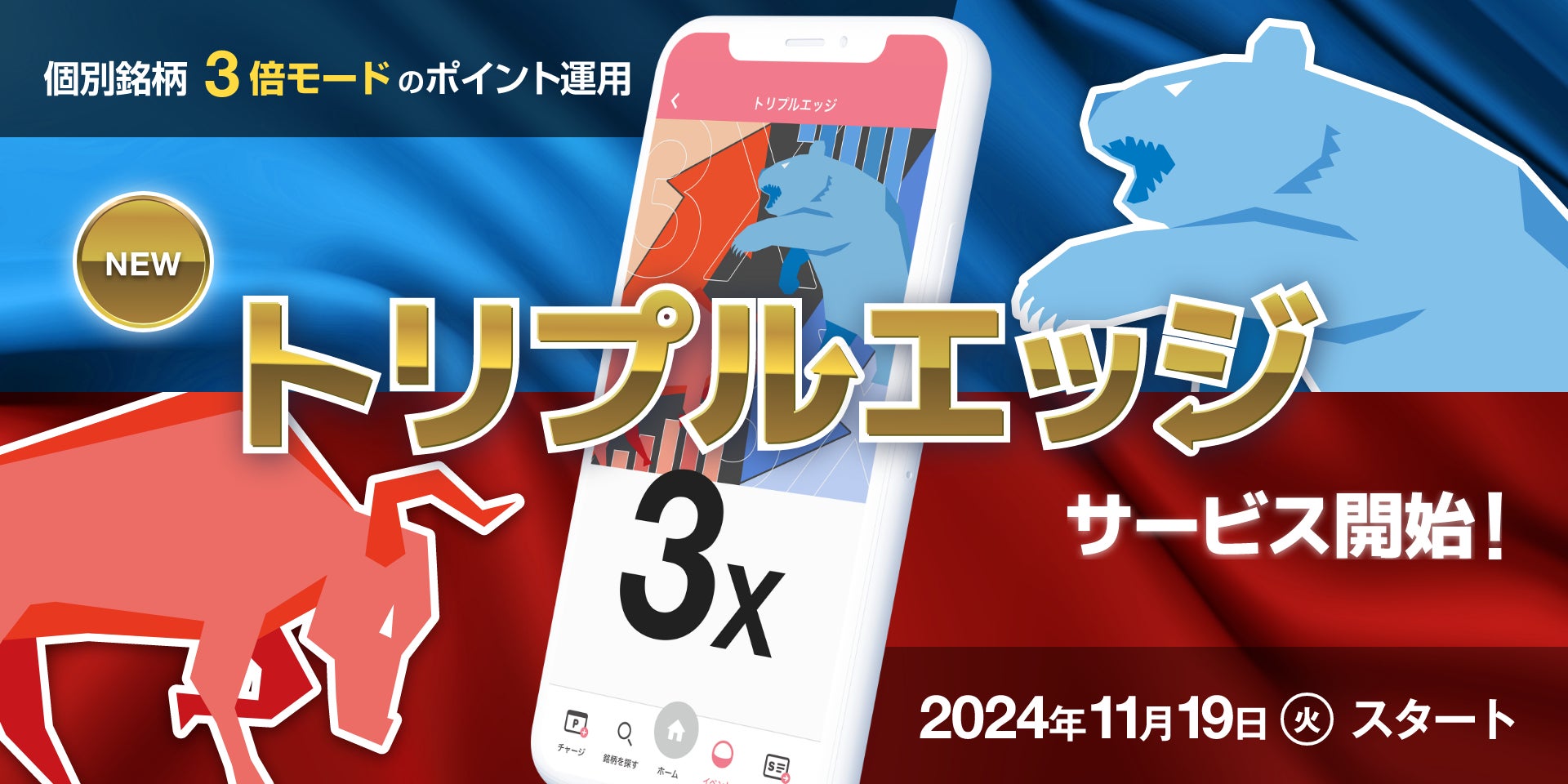 STOCK POINT株式会社(本社:東京都港区、代表取締役社長:美好琢磨、以下「STOCK POINT」)は、業界初※、個別株の値動きが3倍楽しめるポイント運用サービス、ブルベア3倍「トリプルエッジ」の提供を2024年11月19日(火)より開始いたします。