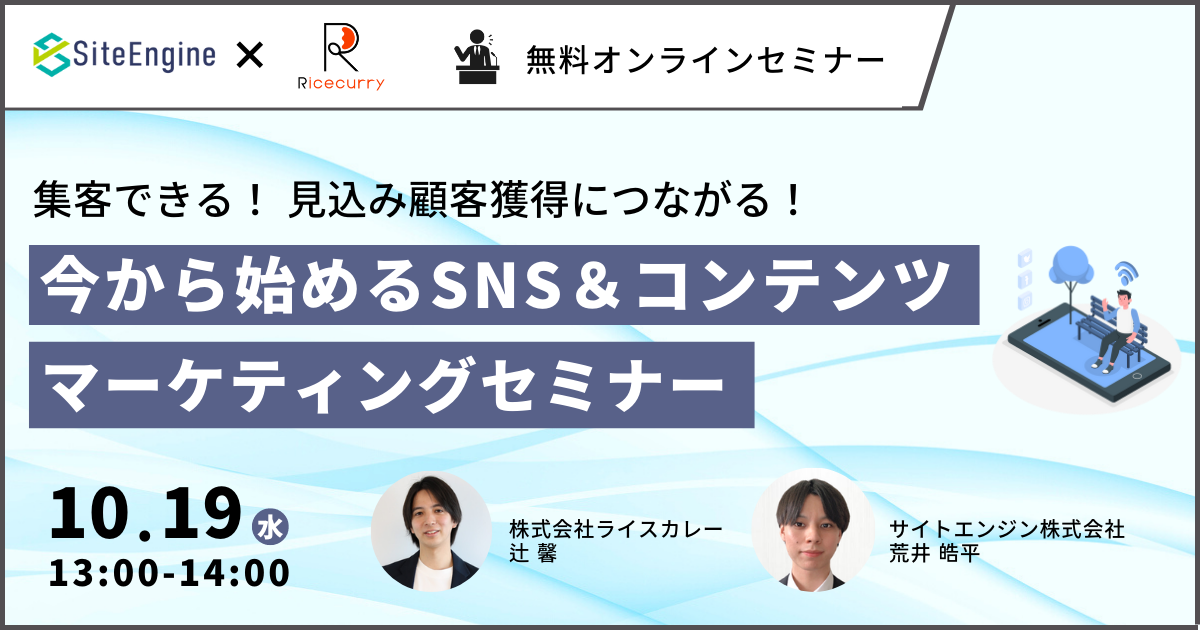 「自己表現にテクノロジーとアイデアを」を経営理念としてWebマーケティング支援サービスを提供するサイトエンジン株式会社(本社:東京都世田谷区 代表取締役:毛塚 智彦)は、2022年10月19日(水)13:00~14:00に、株式会社ライスカレー(本社:東京都渋谷区 代表取締役:大久保 遼)との” 集客できる!見込み顧客獲得につながる! 今から始めるSNS&コンテンツマーケティングセミナー” を開催します。