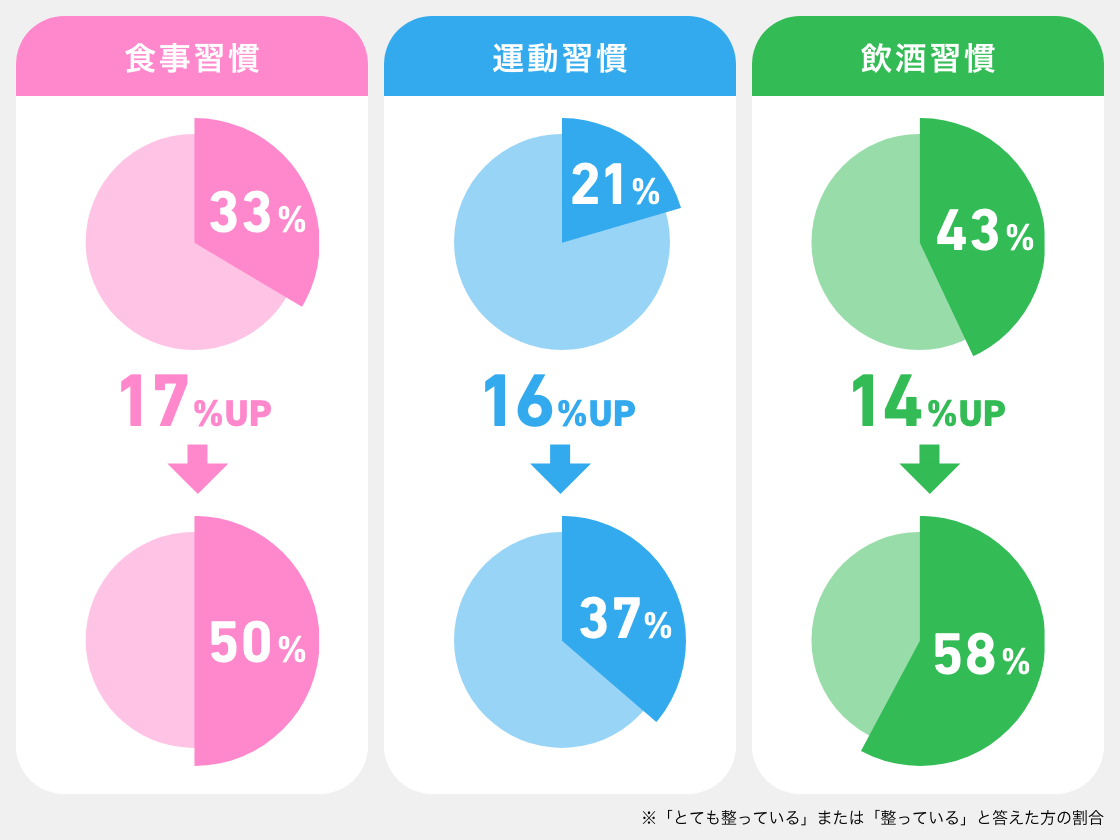 本プログラムは禁煙成功だけでなく、その他の食事習慣や運動習慣、飲酒習慣の改善にも繋がったことが参加者の開始時と終了時のアンケート結果から確認されました。「現在の生活習慣についてお聞かせください」という設問に対する回答を開始時と終了時で比較し、食事、運動、飲酒のそれぞれの習慣に関して感じる状況を「とても整っている」「整っている」「どちらとも言えない」「あまり整っていない」「全く整っていない」の5段階で自己採点した結果、終了時点でそれぞれ「とても整っている」「整っている」の割合が増えました(※4)。みんチャレのピアサポートで禁煙を行うことで、生活習慣を自分で変えることができるという自己効力感が高まり、禁煙以外の生活習慣の改善に繋がったと考えられます。