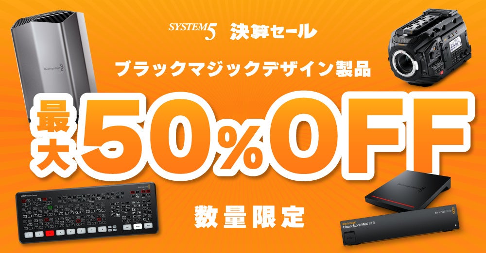 システムファイブ決算特別企画として、大人気のBlackmagic Design製品をスペシャルプライスでご提供。対象商品をメーカー希望小売価格から最大50%お値引きでご提供いたします。さらにBlackmagic Cinema Camera豪華特典キャンペーンもご用意しました。この機会に是非お買い求めください。