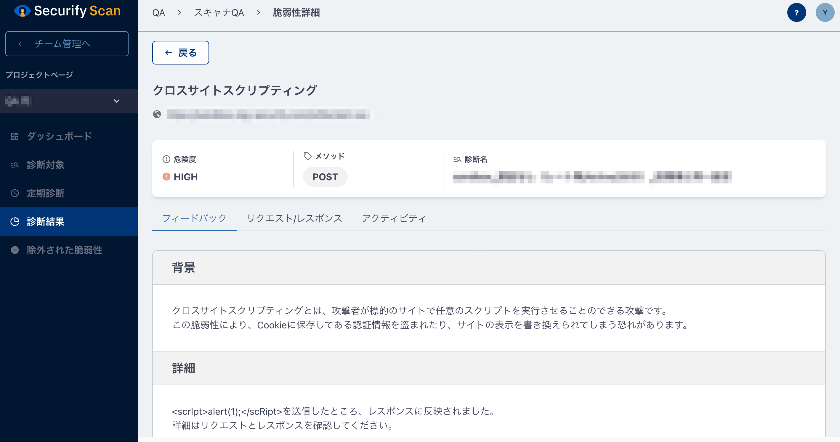 診断結果は画面に出力され、脆弱性の概要解説、該当箇所の修正方法の提案、トリアージに必要な情報を提供いたします。