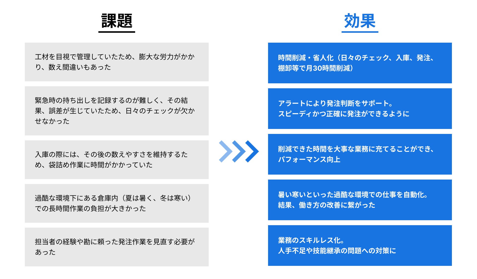 入庫や発注業務を中心に月30時間を削減。過酷な暑寒の倉庫作業を大幅削減し、働き方を改善