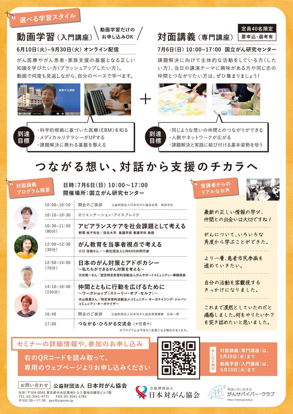 公益財団法人日本対がん協会(東京都中央区、会長 垣添忠生・国立がんセンター名誉総長)は6月より、「がんアドボケートセミナー2025」 を開催します。日本のがんを取りまく問題に何らかの形でかかわりたいと考える方が、がんに関する知識を学び、ご自身の次のアクションに繋がるヒントを見つけ活力を得られる場を目指します。