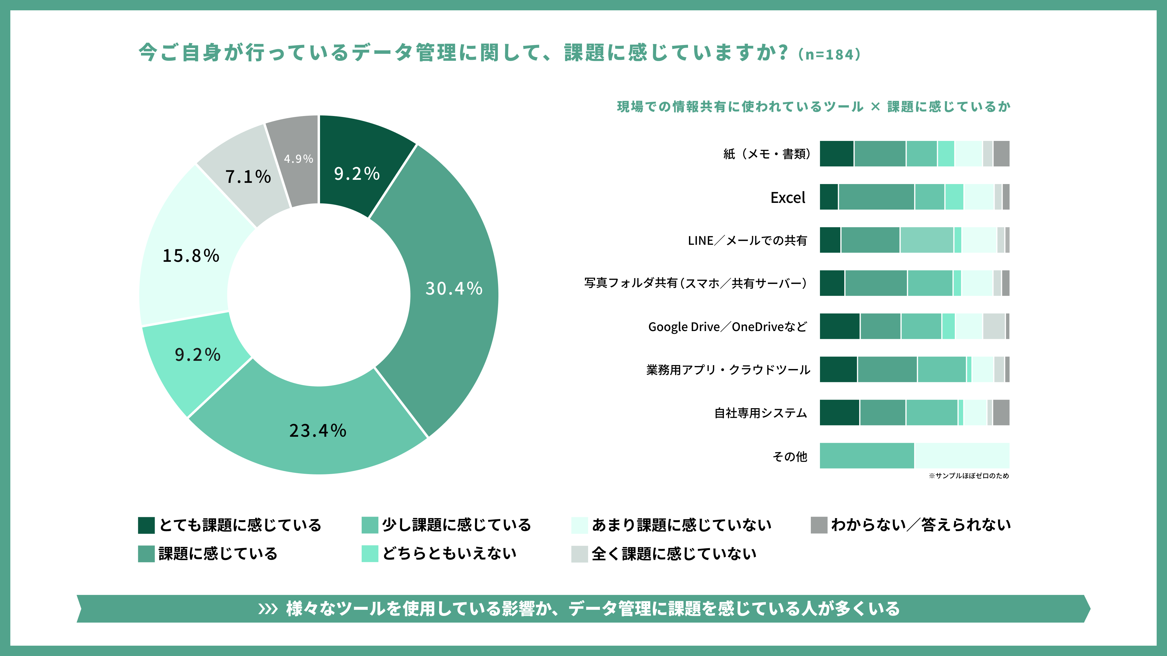 さらに、データの管理方法については、Excelが多いが、紙やスマートフォンなど様々な管理方法を横断的に使用しており、現状の活用方法に課題を持っている人が多くいることが分かりました。様々なツールを使っていると利用する側も使いこなすのに時間がかかったり、社内での連携が難しかったりなどの弊害が起きてしまうため、システムを統一するなどの対応が必要となってきます。