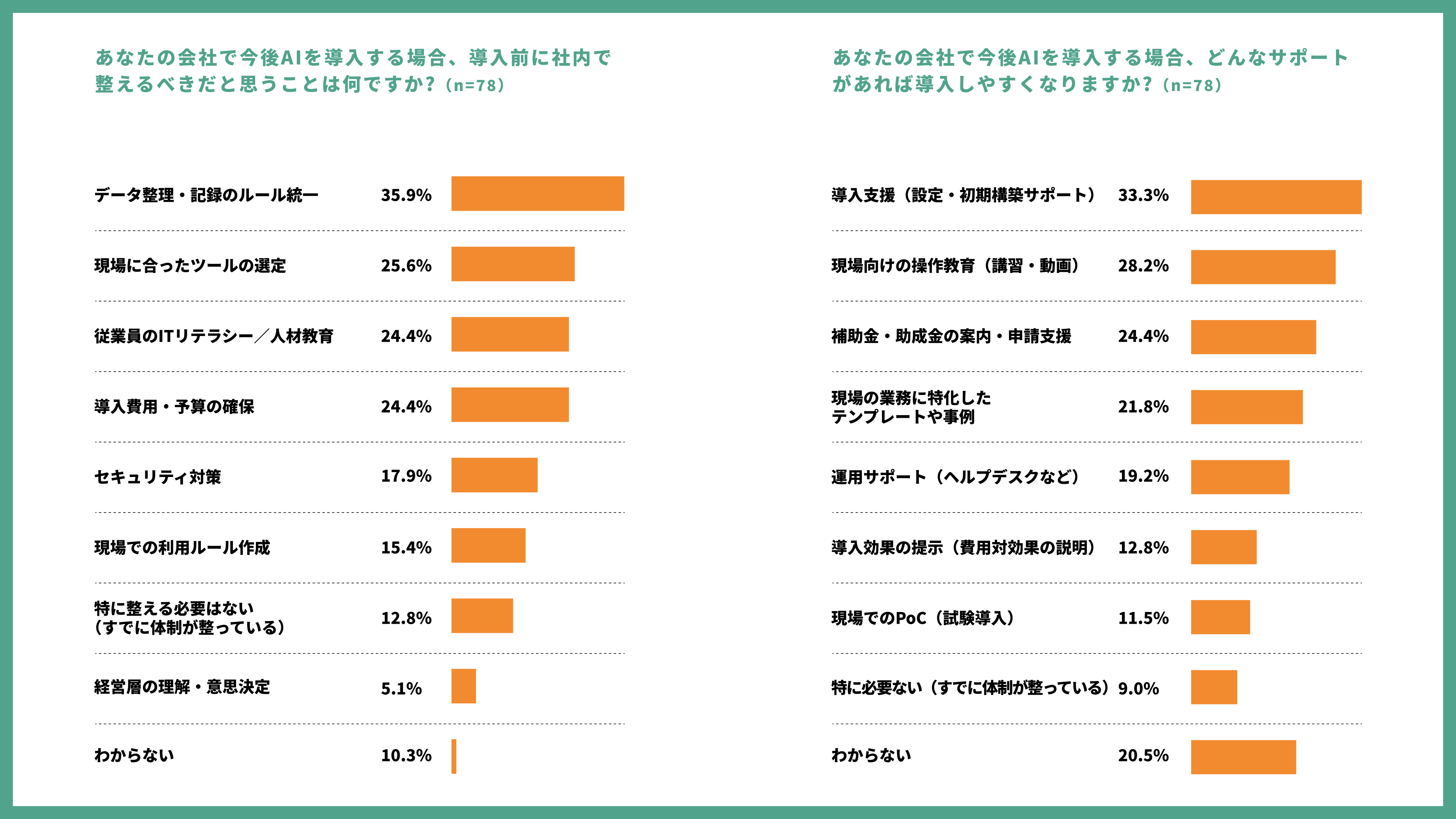 前問と同じく、現場業務でAI活用が行えていないと回答した方を対象にあなたの会社で今後AIを導入する場合にどんなサポートがあれば導入しやすいかを聞くと、「導入支援(設定・初期構築)」が33.3%、「現場向けの操作教育」が28.2%、「補助金・助成金の案内・申請支援」が24.4%、「現場の業務に特化したテンプレートや事例」が21.8%という結果となりました。