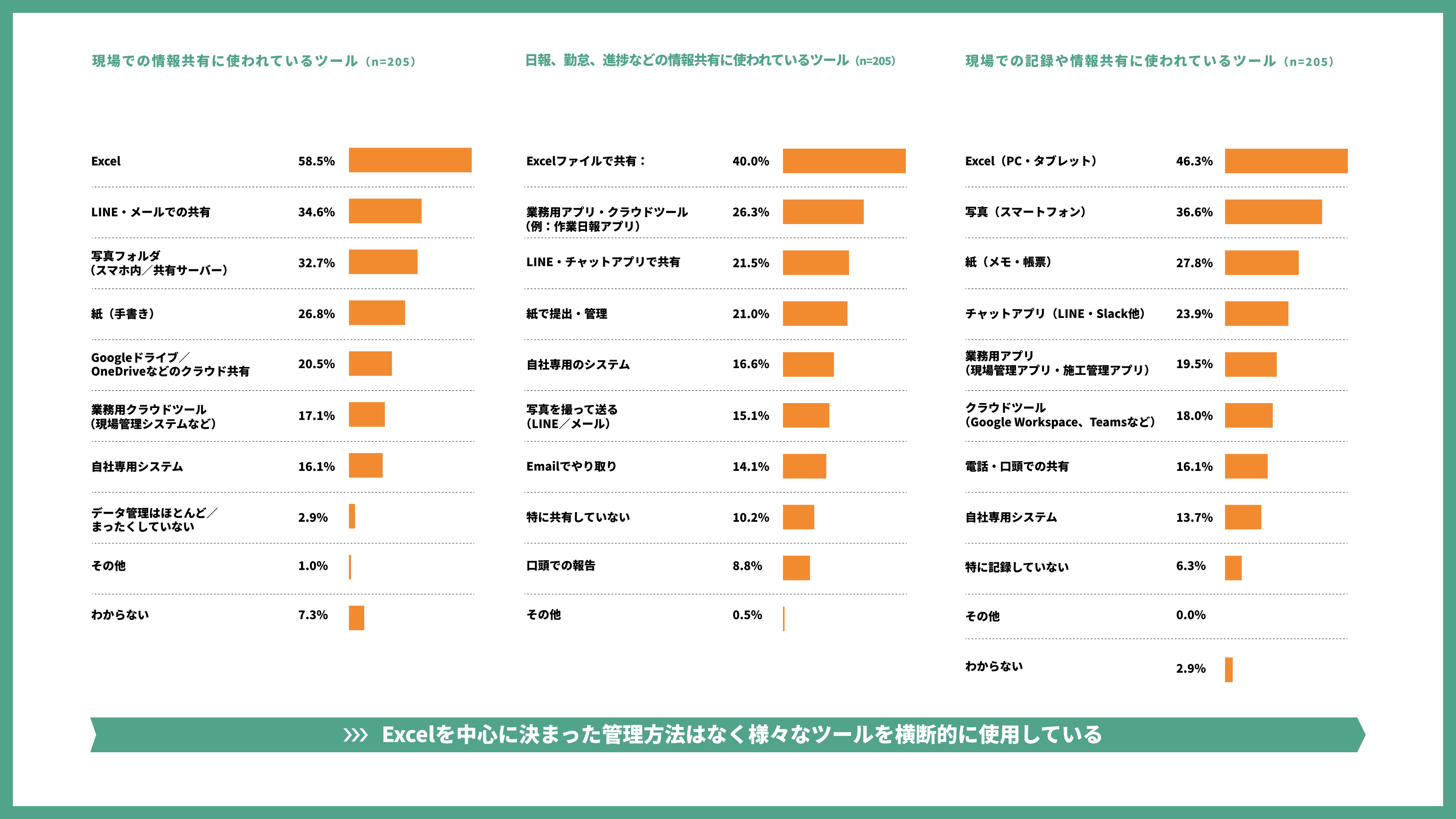 現場での情報共有に使われているツール:Excelが58.5%でトップ。次いで34.6%がLINE、メールでの共有、32.7%が写真フォルダ(スマホ内/共有サーバー)