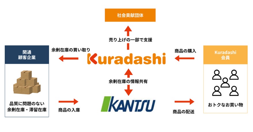 物流サービス事業を展開する株式会社関通(本社:兵庫県尼崎市、代表取締役社長:達城 久裕、以下「関通」)と、ソーシャルグッドマーケット「Kuradashi」を運営する株式会社クラダシ(本社:東京都品川区、代表取締役社長CEO:河村晃平、以下「クラダシ」)は、この度、物流業界における社会課題解決とフードロス領域の新たな価値創造を目指し、事業提携を開始したことをお知らせいたします。本提携により、関通のお客様企業を対象とした「在庫買取・再販支援サービス」を本日より提供開始いたします。