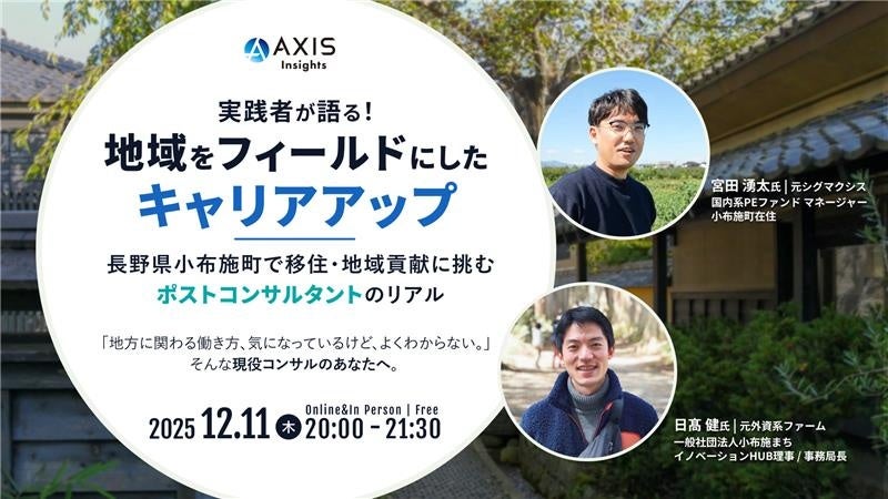 「あらゆる課題は、人で解決する。」をコーポレートステートメントとするアクシスコンサルティング株式会社(本社:東京都千代田区/代表取締役社長 COO:伊藤 文隆)は、2025年12月11日(木)午後8時より、オンライン・オフライン同時開催セミナー「実践者が語る!地域をフィールドにしたキャリアアップ 長野県小布施町で移住・地域貢献に挑むポストコンサルタントのリアル」を開催いたします。