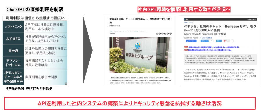 アルサーガパートナーズが行ったChatGPTに関する経営者の意識調査(https://www.arsaga.jp/news/reserch-release-gpt/)によると、ChatGPTの利用を制限している企業の主な理由は「情報漏洩や著作権侵害などのリスクへの懸念」であることが明らかになりました。セキュリティ上の懸念を解消するため、多くの企業が直接的なChatGPTの利用を制限し、社内でGPT環境を構築して活用する動きが広がっています。