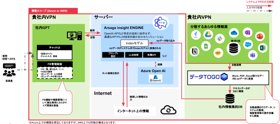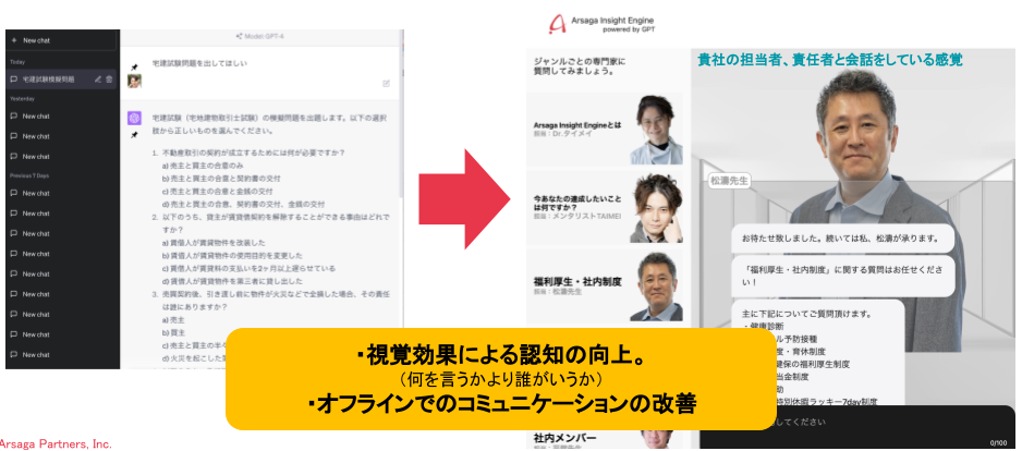 2023年4月に、OpenAI社のAPIを活用し、社内ローカル情報で学習させた社内FAQである「Arsaga Insight Engine powered by GPT」を展開しました。
