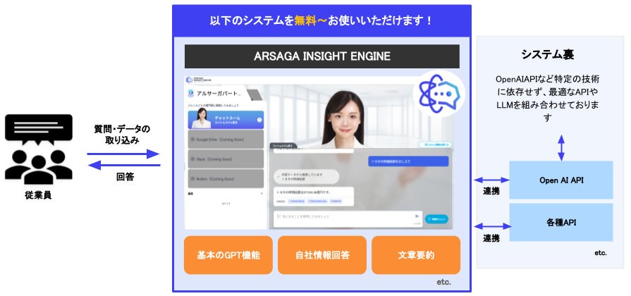 無料でスタートでき、自社情報を取り込み・回答できるSaaS版サービス『ARSAGA INSIGHT ENGINE powerd by GPT』を6月29日(木)より提供開始しました。
