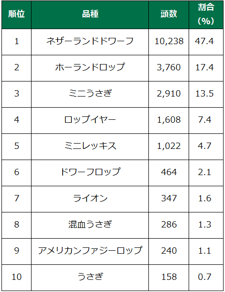 - 人気品種No.1はネザーランドドワーフ、全契約の約半数