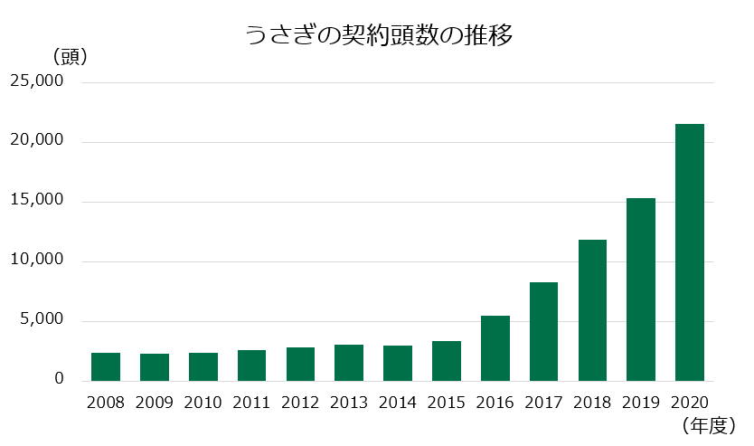 契約頭数は2008年度(2,359頭)から2015年度(3,384頭)まではほぼ横ばいでしたが、2016年度以降、年平均約145%の増加率に。2015年度から2020年度で、約6.4倍に急増しています。うさぎを家族の一員として迎え、その家族の万が一に備えて、ペット保険に加入する方が増えているからこその結果といえるかもしれません。
