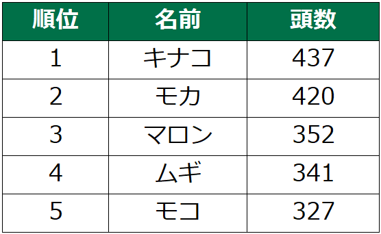 「キナコ」はアニコム損保による「犬の名前ランキング2022」(女の子部門9位)、「猫の名前ランキング2022」(総合6位)でも上位にランクインしており、様々なペットに共通して人気の名前です。2位と3位はそれぞれ「モカ」と「マロン」でした。