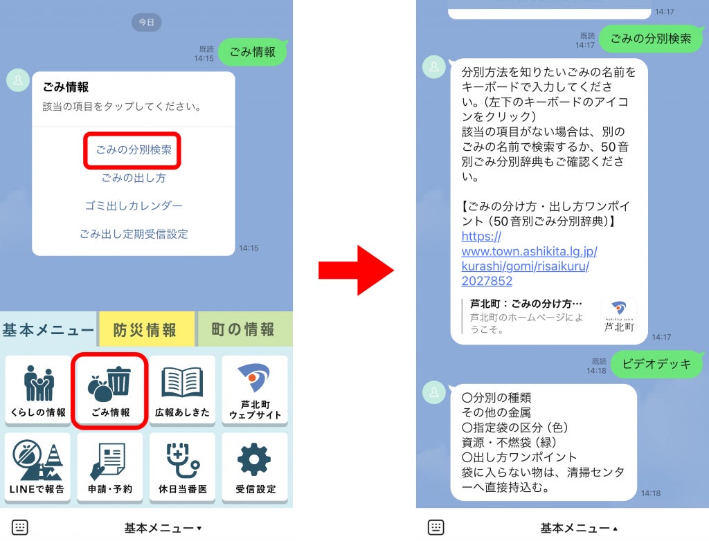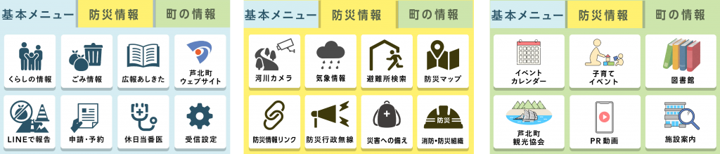 今回のリニューアルでリッチメニューのタブ機能を導入し、デザインも一新しました。暮らしの情報やごみなどの基本のメニューに加えて、防災情報と町の情報のメニューを追加。さまざまなコンテンツをLINEから調べることが可能となりました。