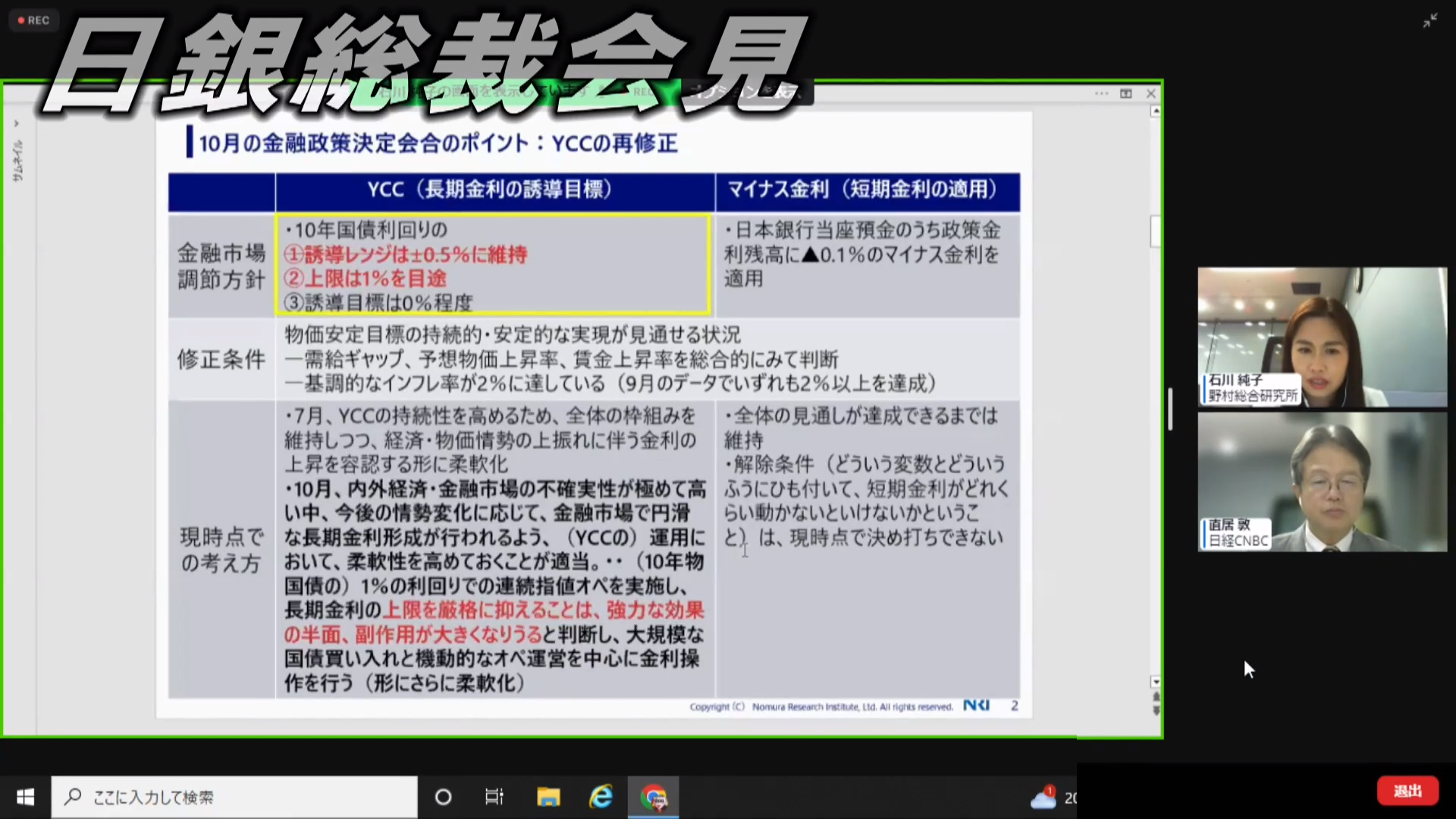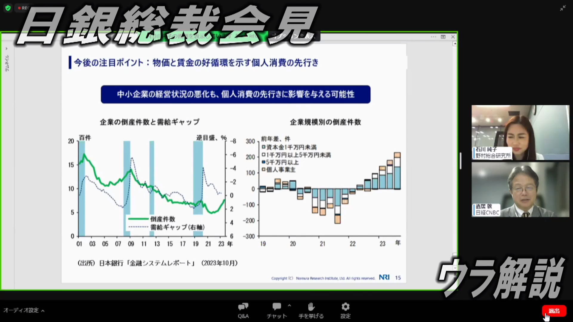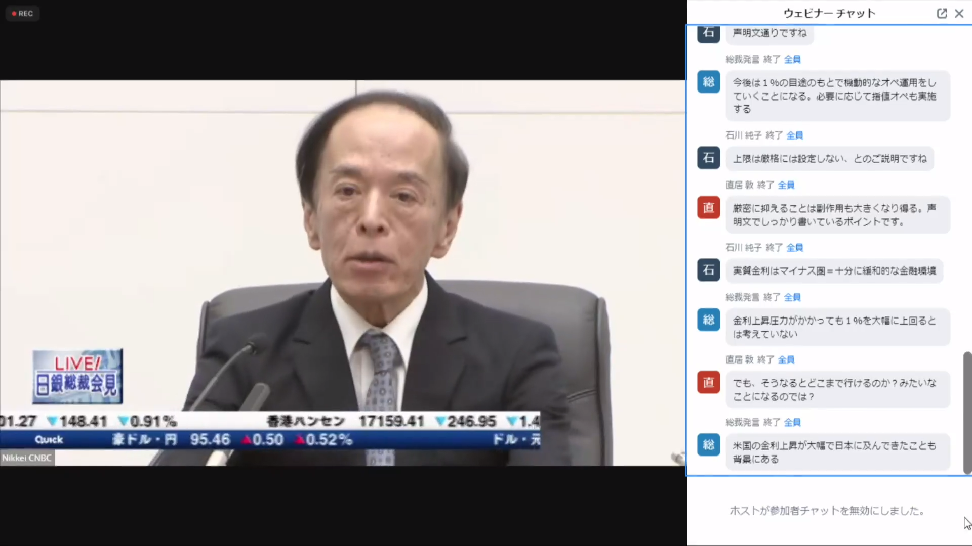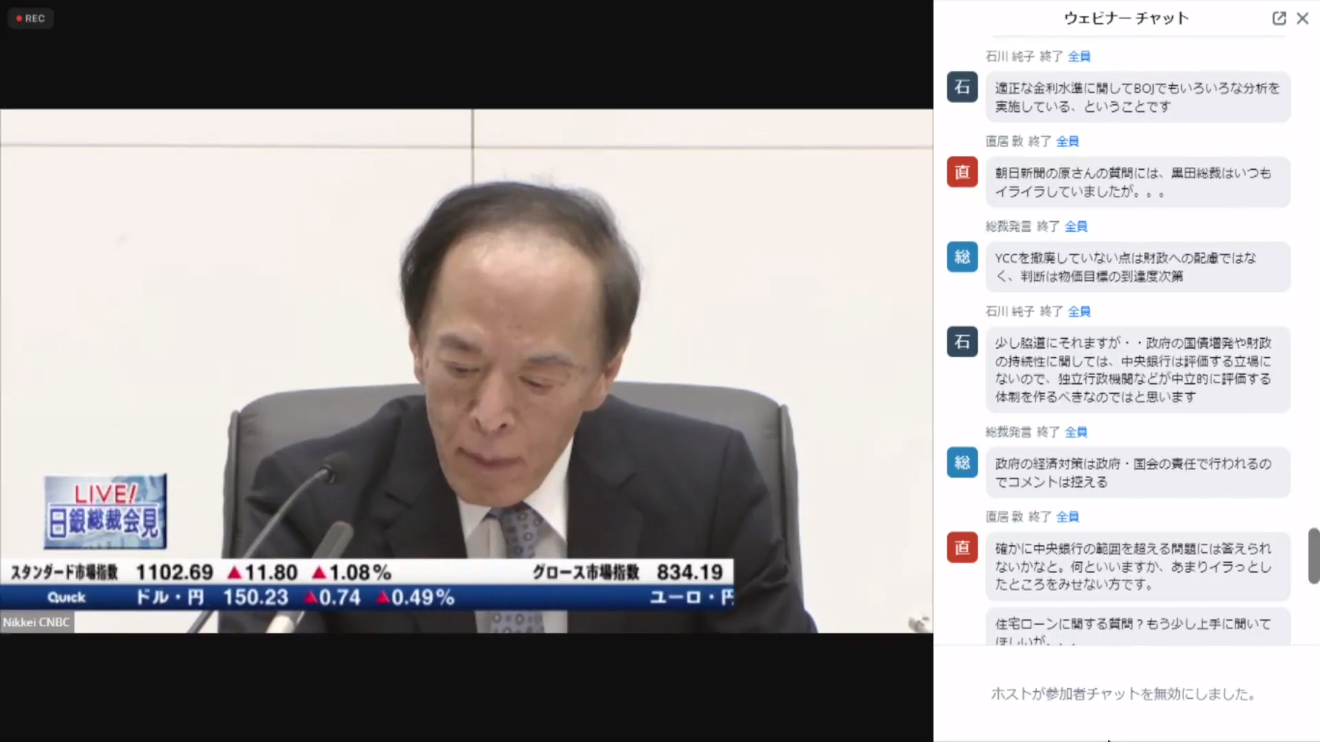 植田総裁の発言内容や記者の質問意図について、Zoomのチャット機能を使ってリアルタイム解説します。植田総裁の注目発言もチャット内で表示されます。