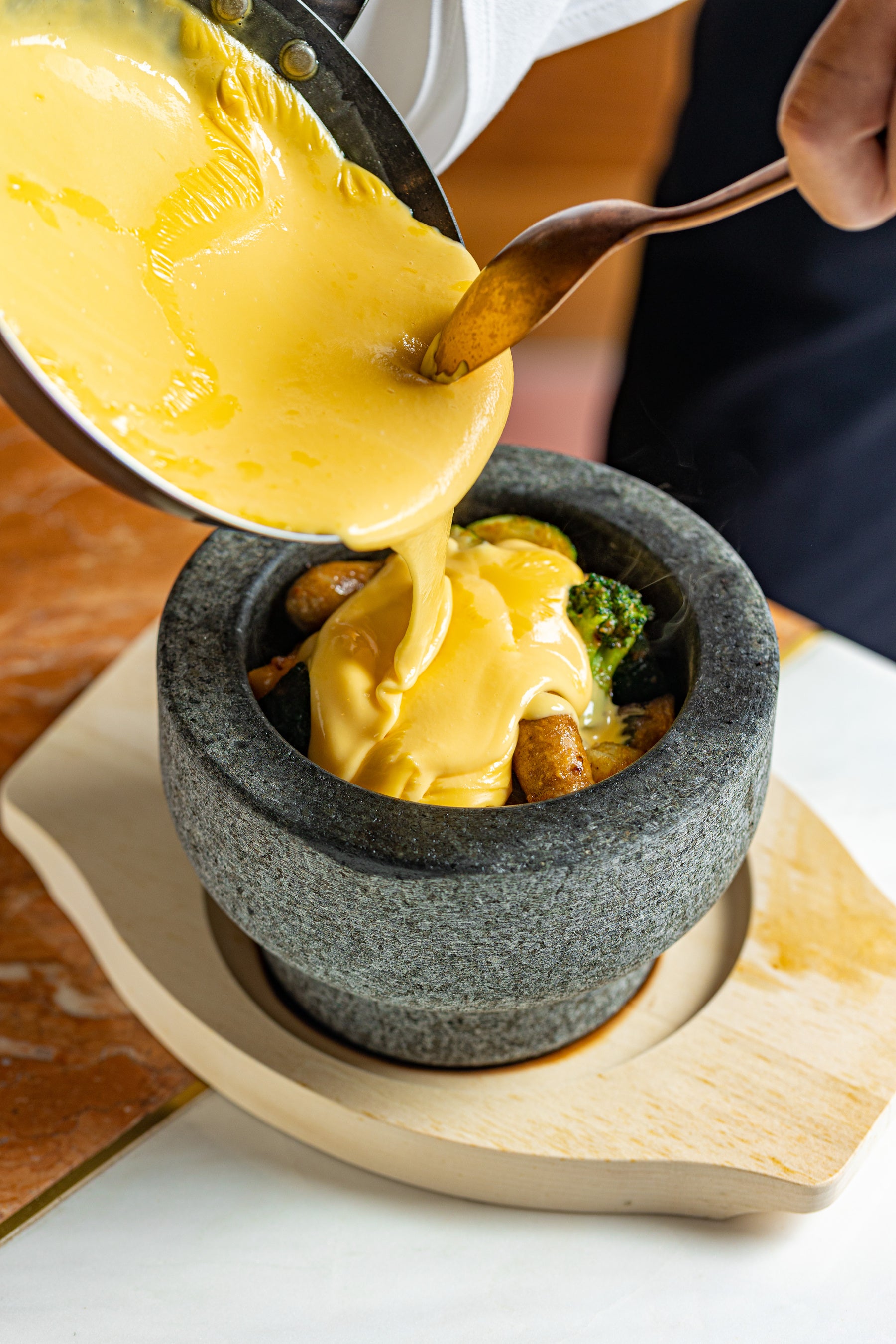 その他にもメキシカン・チーズフォンデュのケソフンディードはモルカヘーテというメキシコの石臼にてご用意。海老とチョリソーと野菜を入れてお客様の目の前で3種類のチーズを使った特製チーズソースをたっぷりと流し入れます。アツアツでグツグツととろけるチーズが食欲をそそります。タコスはお好きなフィリングやサルサをトッピングして、手巻き寿司のようにわいわいと皆さんでお楽しみください。