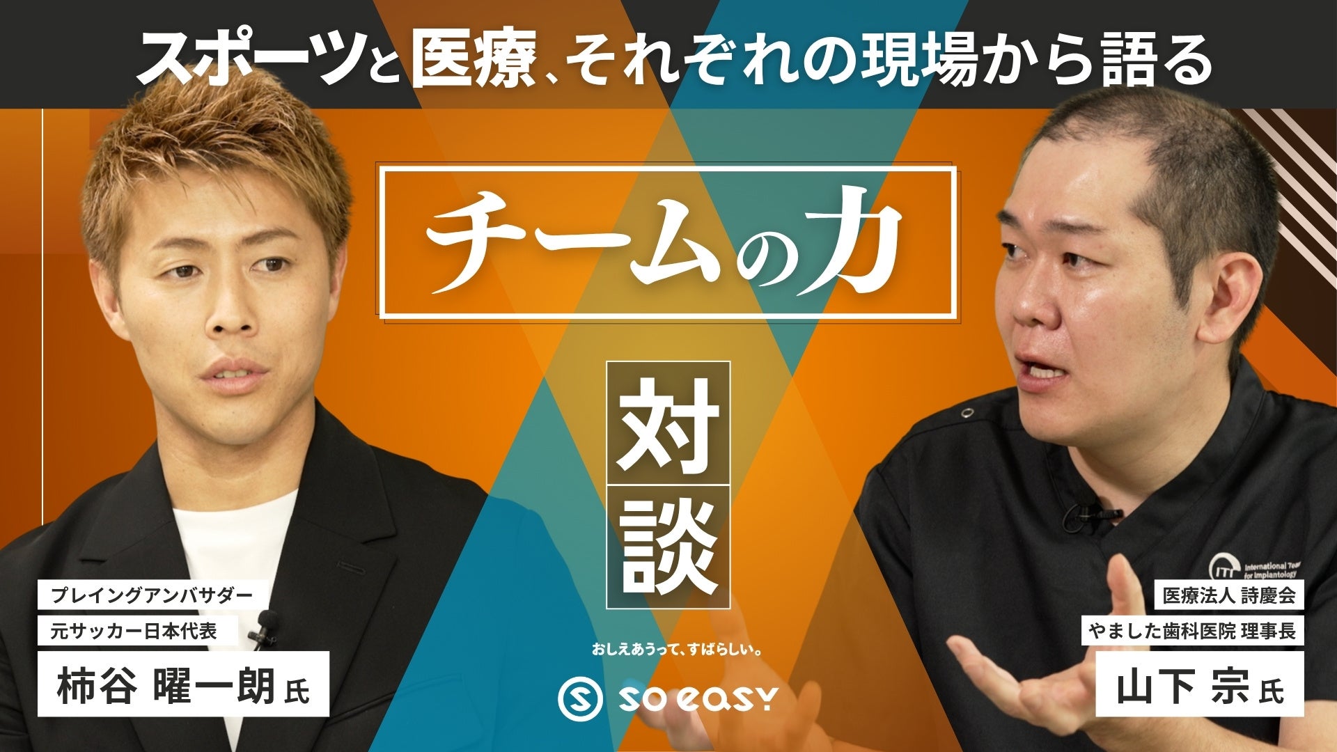 日本のサッカー界の最前線で活躍し、J1クラブチームでキャプテンを務めてきた柿谷氏と、soeasy buddyのユーザーで、やました歯科医院院長の山下先生に、「スポーツと医療、それぞれの現場から語るチームの力」というテーマで、チーム・組織を強くするために必要なことを語っていただきました。