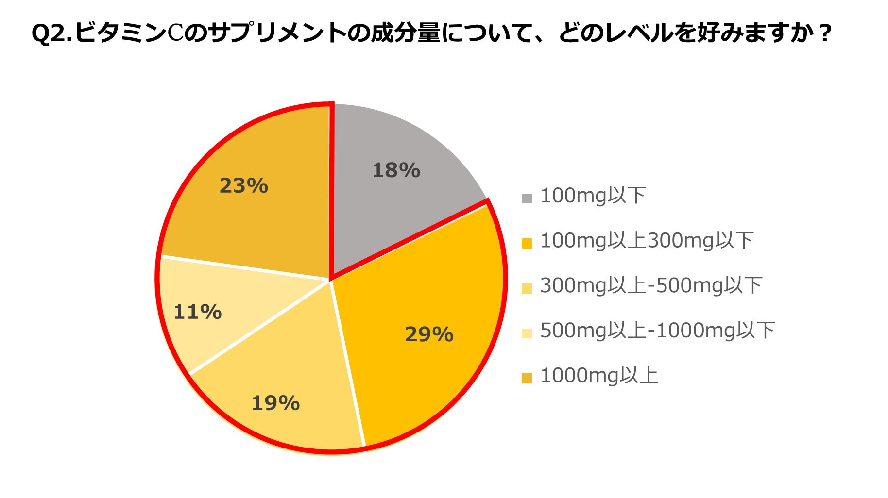 成人(15歳以上)におけるビタミンCの食事摂取基準として100mgが推奨量と定められている中、8割以上の人がサプリメントには100mg以上の成分量レベルを好むことが判明。