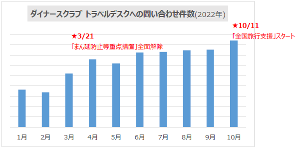 2022年1月~10月にダイナースクラブのトラベルデスクに入った旅行に関する問い合わせ件数の推移を見ると、まず3月21日に「まん延防止等重点措置」が全面解除となったことで、大幅に件数が増加しました。その後、5月に一度微減したものの、6月以降は毎月増加し続けており、多くの人が旅行に行くマインドになっていることを表す結果となっています。とくに「全国旅行支援」開始前後の9月~10月の合計問い合わせ数は、昨年同期間比で187%の件数となっており、制度を活用した旅行ニーズがますます高まっていることが見て取れます。