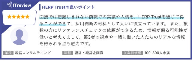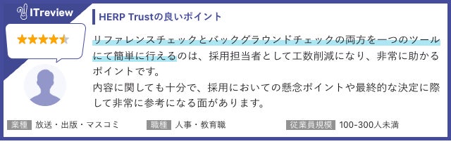 この度『HERP Trust』は、「ITreview Grid Award 2025 Winter」のリファレンスチェックサービス部門において「Leader」を初受賞しました。また、総合満足度においても5点満点中4.5点と高評価を獲得しました。(11レビュー、2025年1月16日時点)