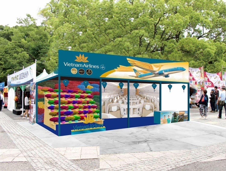 同社のブースでは、SNSで「映える写真が撮れる」と話題の観光スポット 「クアン フー カウ(Quang Phu Cau)線香村」 を再現。ベトナム航空のコーポレートカラーである鮮やかな “ベトナムブルー” を基調としたブースデザインや、フライトアテンダントをモチーフにしたオリジナル着ぐるみが来場者をお迎えします。