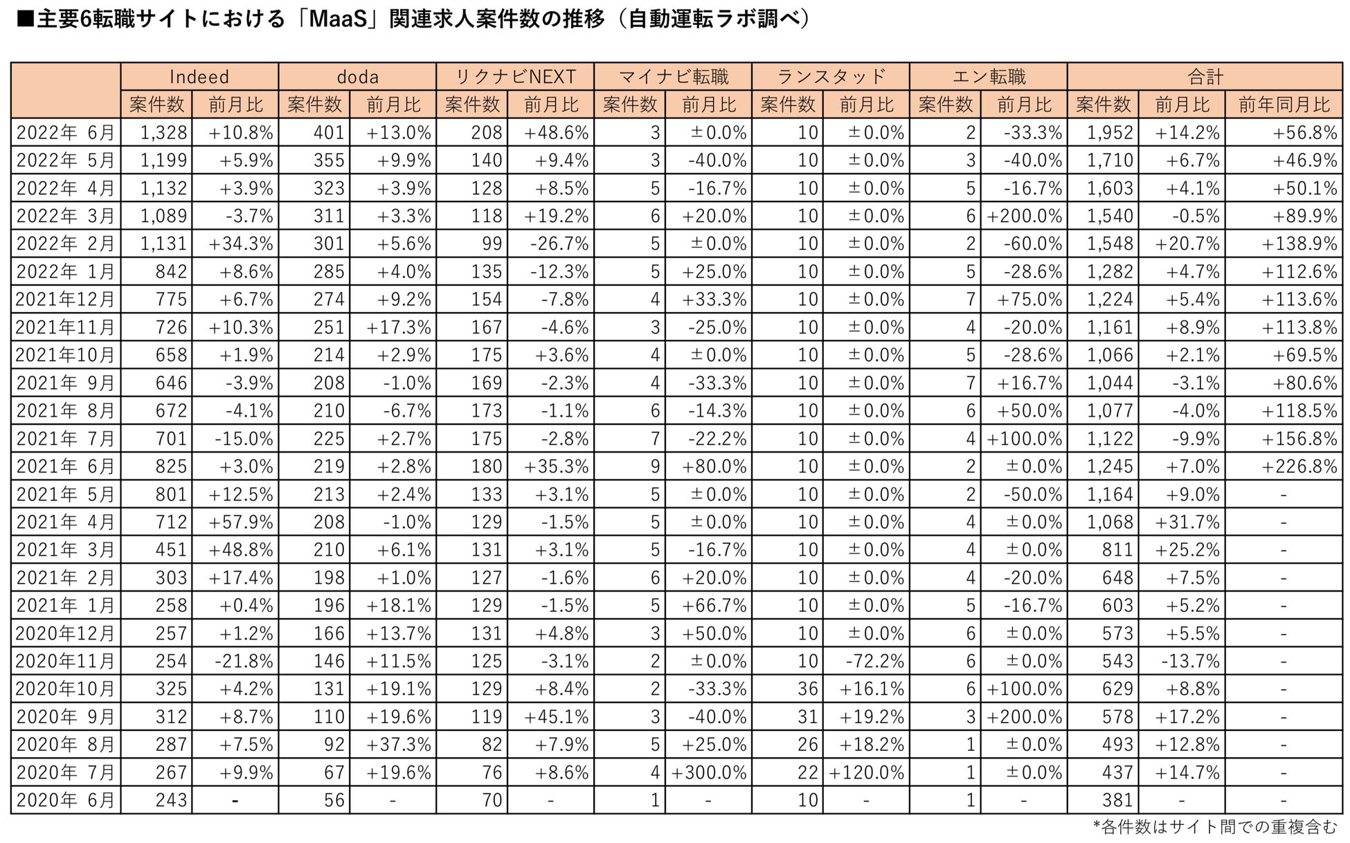 「MaaS」の関連求人案件数(主要転職6サイト)は2022年6月末時点で、前月比14.2%増、前年同月比56.8%増の1,952件となりました。前月比での増加は3カ月連続、前年同月比での増加は13カ月連続となります。