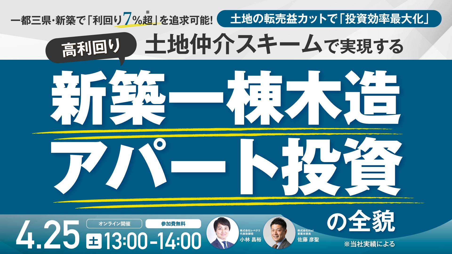 4月25日(土)13時よりオンライン開催!土地の転売益をカットして利回り7%超*を実現 一都三県・新築一棟アパート投資の新戦略