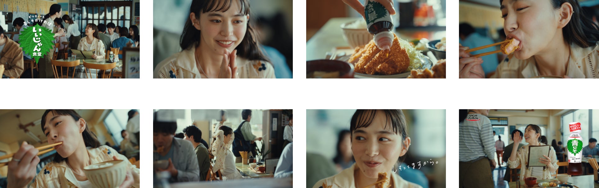 「いいじゃん食堂 とんかつ篇」では、井桁さんがとんかつ定食に唐揚げを追加して注文。「このまま食べたらアレだけど~…」と、さっぱりとしていてヘルシーさが特徴の『リケンのノンオイル 青じそ』をかけ、「しそってますから」「いいじゃん、いいじゃん」と自分に言い聞かせながら幸せそうに頬張ります。終盤では髪を結び気合いを入れ直し、気持ちの良いテンポでギルティーフードを食べ進める姿に注目です。最後には追加注文をしようとしている場面も。