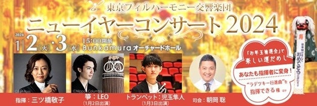 2024年の指揮は、2021年の同コンサートでの凛々しい袴姿も記憶に新しい三ツ橋敬子(みつはし・けいこ)。ソリストには、1998年生まれ、伝統を受け継ぎながら和楽器・箏(こと)の新たな魅力を追求する若き実力者LEO(れお、1月2日公演)と、2009年北海道生まれ、これまで数々の国内コンクールを最年少で制覇し、テレビやSNSを通じて国内外から熱い注目を浴びる14歳のトランペット奏者・児玉隼人(こだま・はやと、1月3日公演)が登場し、司会の朝岡聡とともに新しい年を祝います。