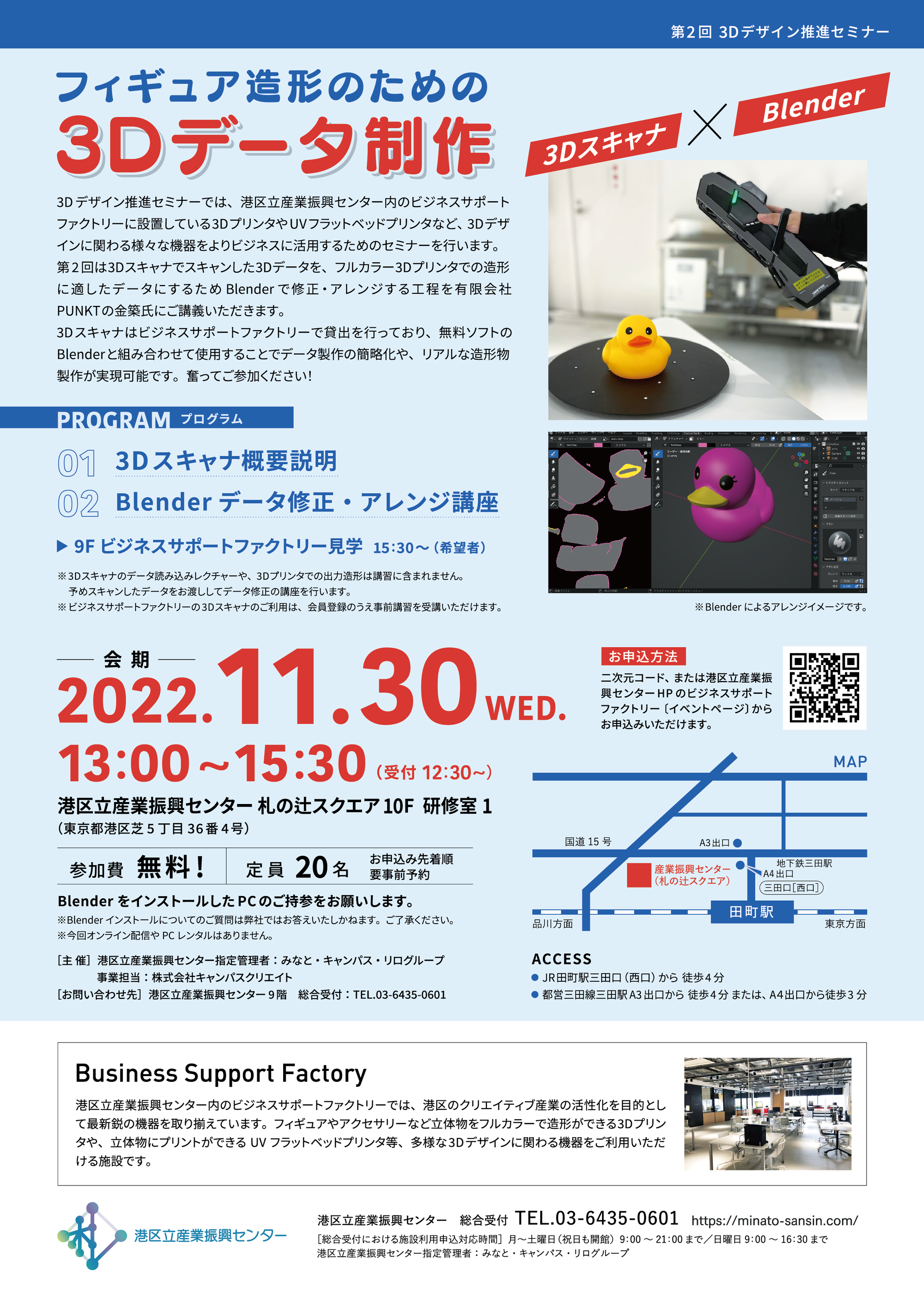 3Dスキャナはビジネスサポートファクトリーで貸出を行っており、無料ソフトのBlenderと組み合わせて使用することでデータ製作の簡略化や、リアルな造形物製作が実現可能です。奮ってご参加ください!